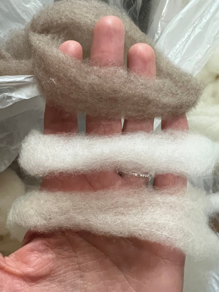 We’re also proud to offer two beautiful blended rovings. Our 50/50 cashmere/tussah silk blend is processed out of our brown cashmere. $22 per ounce.