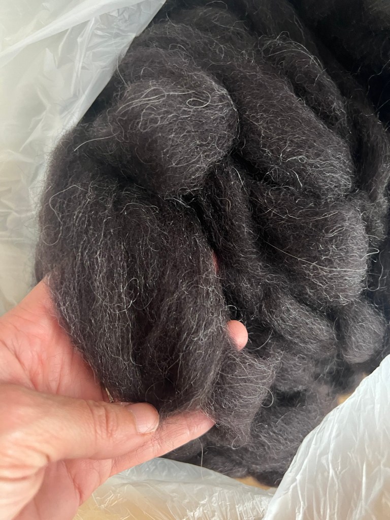 And if you want to bring a little llama into your life, we have a black 70/30 llama/merino blend roving featuring fleece from our herd guardian llama, Annie. $7 per ounce.