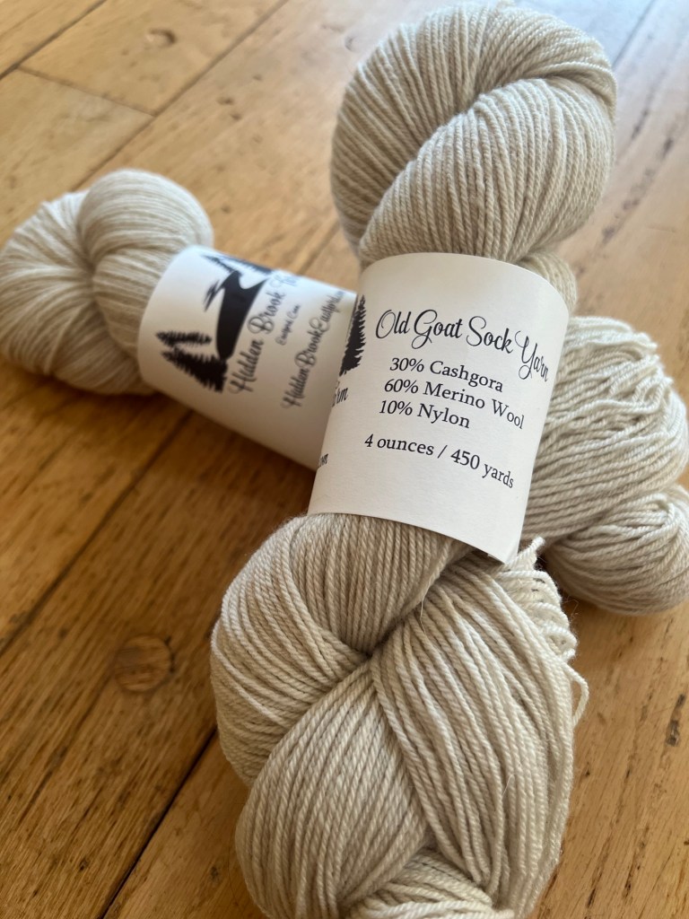 For the non-spinners, our first millspun yarn is our Old Goat Sock Yarn — a 60% merino/30% cashgora/10% nylon blend that uses the fleeces from our beloved herd members who don’t meet our high cashmere quality standards, either from the unfortunate genetic luck-of-the-draw or coarsening with age. $45 per skein (450 yards/4 ounces).