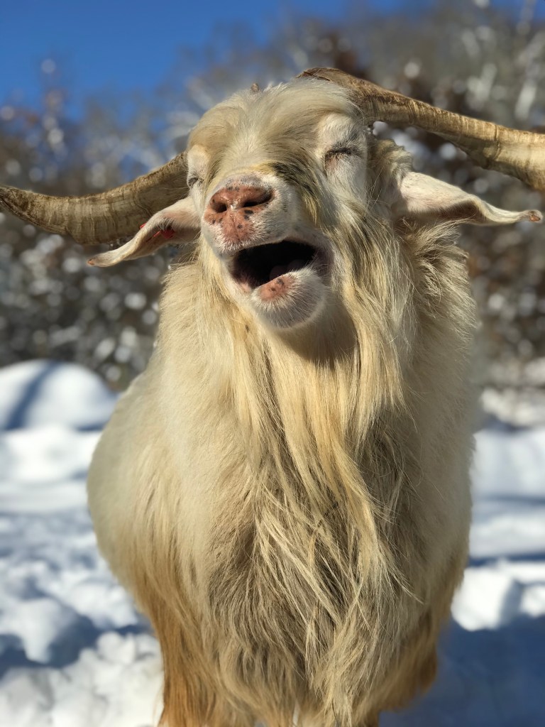 Aeros is a total package. He has shown at the Cashmere Goat Association (CGA) annual show in Tunbridge, Vermont, and is a sire of winners, including the 2019 Grand Champion Wether, CFC Sir Clyde; 2021 NWCA/CGA Fleece Competition first-place doe, HBF Athena; 2021 and 2023 NWCA/CGA first-place doe, HBF Cher; and our 2023 CGA/NWCA Grand Champion Buck, HBF Loki.